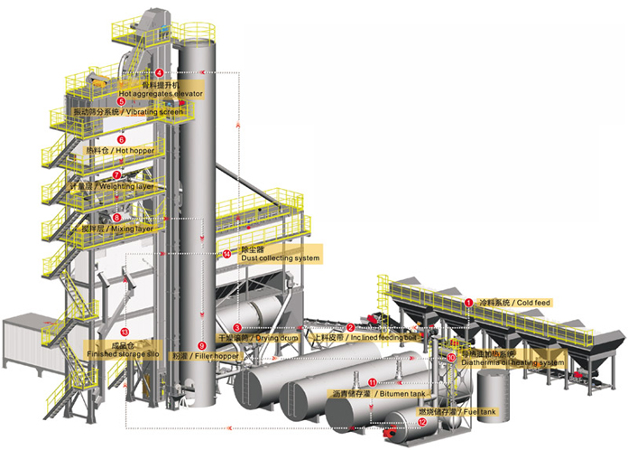 冷骨料給料機(jī),拌合樓、成品倉(cāng)、除塵器、瀝青罐均為整體模塊化,便于運(yùn)輸安裝。