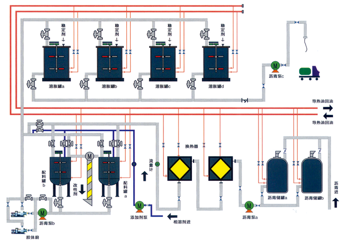 本公司研制生產的瀝青改性設備適合于一定溫度的基質瀝青,SBS和添加劑混合在一起,經溶脹、研磨、孕育等生產出高質量的聚合物改性瀝青,具有工作效率高、可靠性強、顯示直觀、易操作維護等優點,該設備的加工工藝特別適合于SBS改性劑的改性加工, 再配以專有的穩定性技術,徹底解決改性瀝青的離折問題,采用人機界面和PLC相結合的控制方式,可使整個生產流程形象直觀地展現出來,實現集中控制,操作簡單。核心部分的元器件均采用國際知名品牌或國內產品,大大提高了設備運行的可靠性和穩定性,可與瀝青油庫,瀝青攪拌設備等相關產品配套使用。